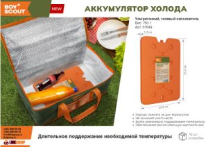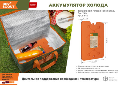 Описание: Размер: 31 х 25 x 1,2 см. Вес 750 г . Ультратонкий аккумулятор холода не съедает полезное пространство, а благодаря увеличенному размеру покрывает большую площадь дна или стенок термосумки.