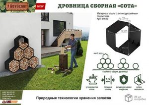 Описание: Размер одной соты в собранном виде 52х62х40 см. Дровница сборная "Сота" BOYSCOUT - это отличный вариант для украшения ваших дачных участков, беседок, веранд и домашней обстановки. Форма в виде пчелиной соты позволяет разместить ее как у печки или камина, так и на улице около дома. Есть возможность располагать несколько сот вместе, создавая тем самым большую систему для хранения и сортировки. Ребра жесткости и сталь 1,5 мм делают конструкцию более жесткой и не позволяют сотам «сложиться» при большом весе, а антикоррозийное покрытие защитит дровницу от воздействий окружающей среды, что позволит увеличить срок ее службы, если дровница будет располагаться на улице.