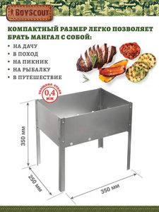 Размер: 35 х 25 х 35 см. Толщина металла 0,4 мм. Большой популярностью пользуются разборные стальные мангалы. Простота конструкции позволяет осуществлять быструю сборку. В разобранном виде мангал очень компактен и не занимает много места. Переносной мангал Boyscout станет находкой для любителей охоты и рыбалки. Сборка и разборка мангала осуществляется без использования каких-либо инструментов. Поэтому Вы сможете сразу же полакомиться своей добычей.