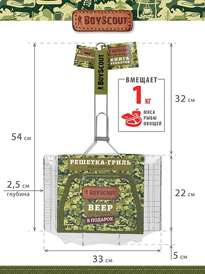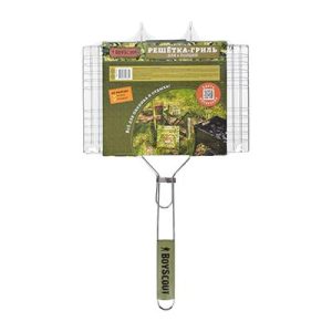 Размер: 54(+5)x33x22x2,5 cм Жарочная поверхность 33*22*2,5 см Решетки для барбекю BoyScout в отличие от шампуров универсальны. Они подходят не только для мяса, рыбы, бифштексов, курицы, но и для сарделек, сосисок, овощей и прочего. Мы предлагаем решетки для барбекю с антипригарным и хромированным покрытием, а также решетки из нержавеющей стали. Решетки имеют деревянные ручки, которые не нагреваются при использовании. Разнообразие размеров и форм позволяет Вам без особых хлопот приготовить вкусную еду в любых количествах.