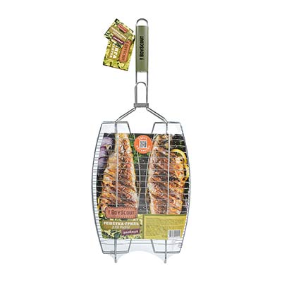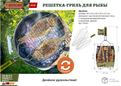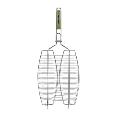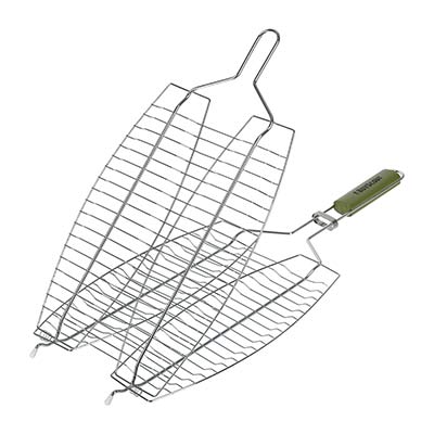 Решетка-гриль для рыбы. Двойная. 60(+3)x36x25x3.5 см, Жарочная поверхность 36x25x3.5 см Выполнена из высококачественной стали с пищевым хромированным покрытием, дополнена деревянной ручкой с фиксирующим кольцом для надежной фиксации верхней створки. Усики-фиксаторы позволяют устойчиво закрепить решетку на мангале.