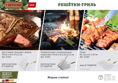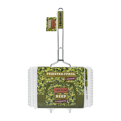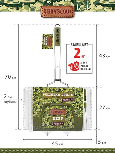 Размер: 70(+5) x 45 x 27 x 2 cм. Жарочная поверхность 45*27*2 см Решетки для барбекю BoyScout в отличие от шампуров универсальны. Они подходят не только для мяса, рыбы, бифштексов, курицы, но и для сарделек, сосисок, овощей и прочего. Мы предлагаем решетки для барбекю с антипригарным и хромированным покрытием, а также решетки из нержавеющей стали. Решетки имеют деревянные ручки, которые не нагреваются при использовании. Разнообразие размеров и форм позволяет Вам без особых хлопот приготовить вкусную еду в любых количествах.