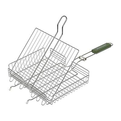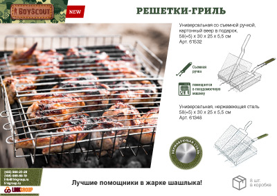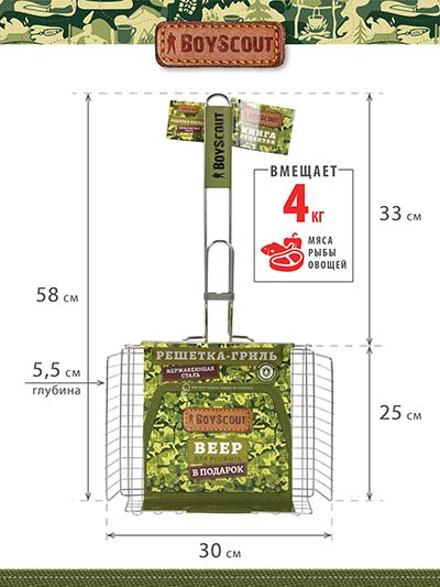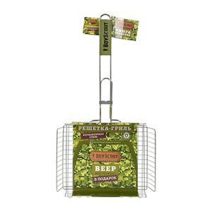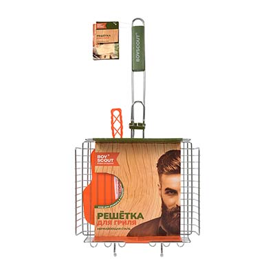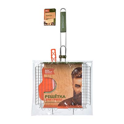 Размер 63*30*25*5,5 см Жарочная поверхность 30*25,5,5 см Решетки для барбекю BoyScout в отличие от шампуров универсальны. Они подходят не только для мяса, рыбы, бифштексов, курицы, но и для сарделек, сосисок, овощей и прочего. Мы предлагаем решетки для барбекю с антипригарным и хромированным покрытием, а также решетки из нержавеющей стали. Решетки имеют деревянные ручки, которые не нагреваются при использовании. Разнообразие размеров и форм позволяет Вам без особых хлопот приготовить вкусную еду в любых количествах.